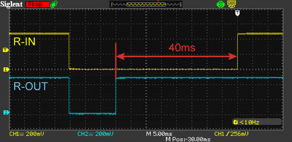 Apply the powerful R-OUT relay. So it turning on takes more time. The selected time is 40mS. During this time turn on the vast majority of used types of relay. It use of low power R-IN relay. To turn on such relays enough 10mS.